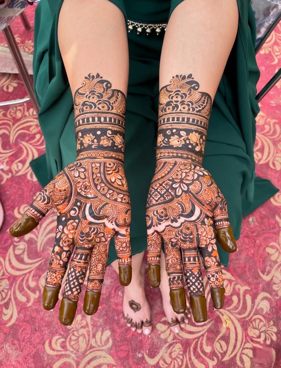 Look is elegant and festive, suggesting a special occasion such as a wedding or celebration. The vibrant outfit in the background enhances the beauty of the dark henna patterns, making the artwork stand out prominently.