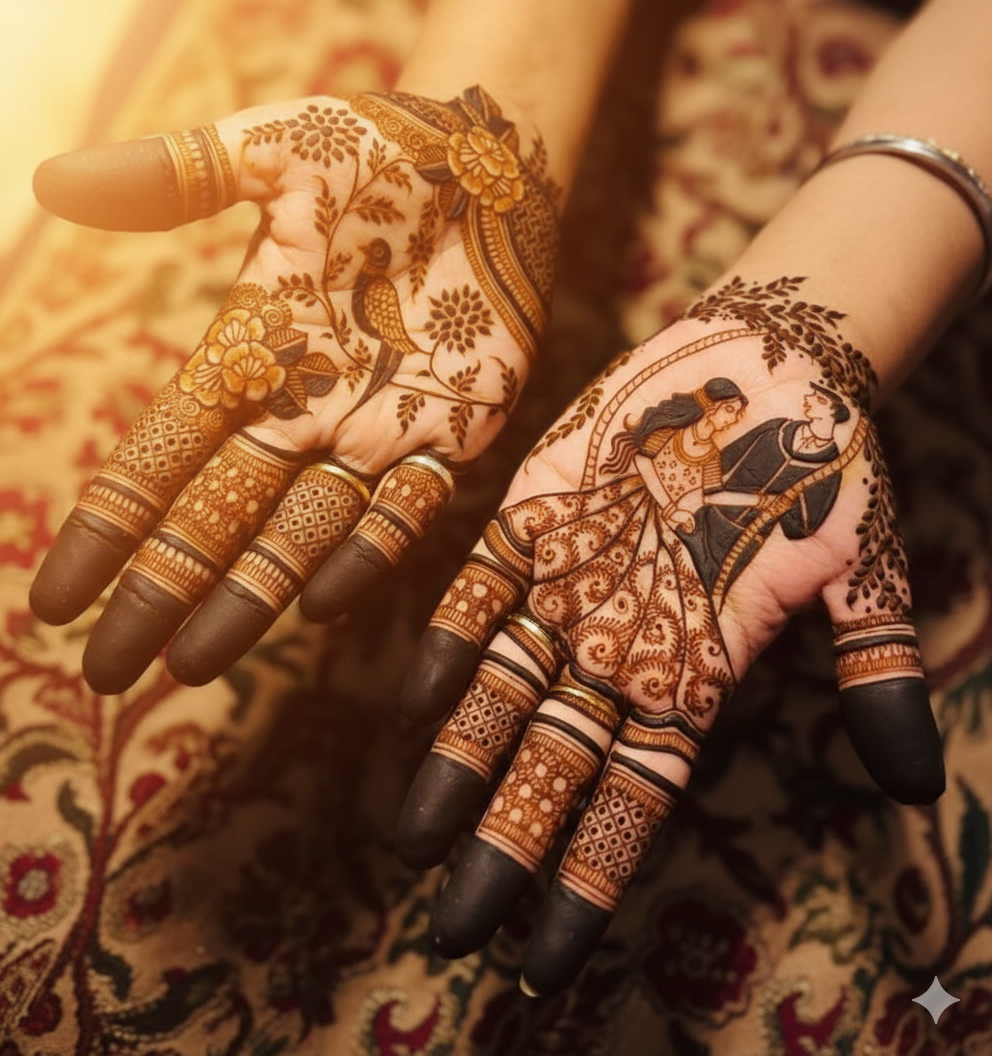 The palms are adorned with highly detailed designs. One hand features a delicate bird amidst floral vines, while the other showcases a classic “Dulha-Dulhan” (bride and groom) motif, symbolizing love and union.