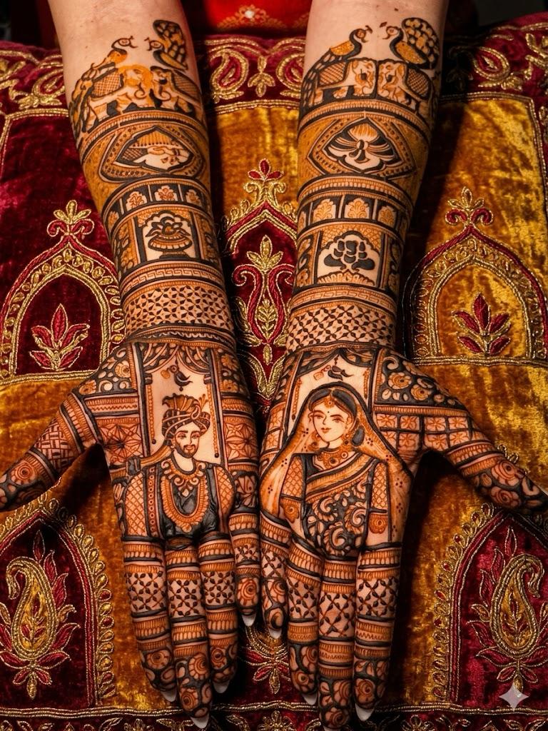 This design shows a stunning bridal mehndi design covering both hands with detailed and traditional patterns. The palms feature beautiful portraits of the bride and groom, symbolizing love and the beginning of their new journey together. The design also includes peacock motifs, floral patterns, and decorative bands extending up to the arms, giving the mehndi a rich and elegant look.