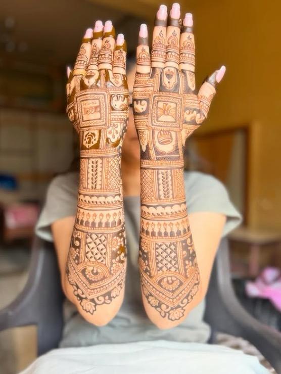 This design is a stunning example of traditional bridal mehndi, covering both palms and forearms with rich, intricate detailing. The artwork features beautifully crafted elephant motifs on the palms, symbolizing grace and beauty, along with elegant floral patterns, lattice work, kalash ,havan kund , and decorative bands. The upper arms showcase royal elements like domes and ornamental structures, giving the design a majestic touch. Every section is carefully filled with fine lines and shading, creating a bold, luxurious, and perfectly balanced bridal look.