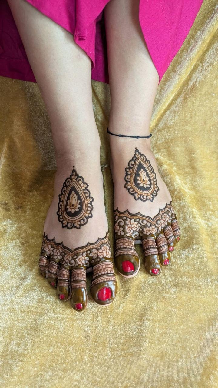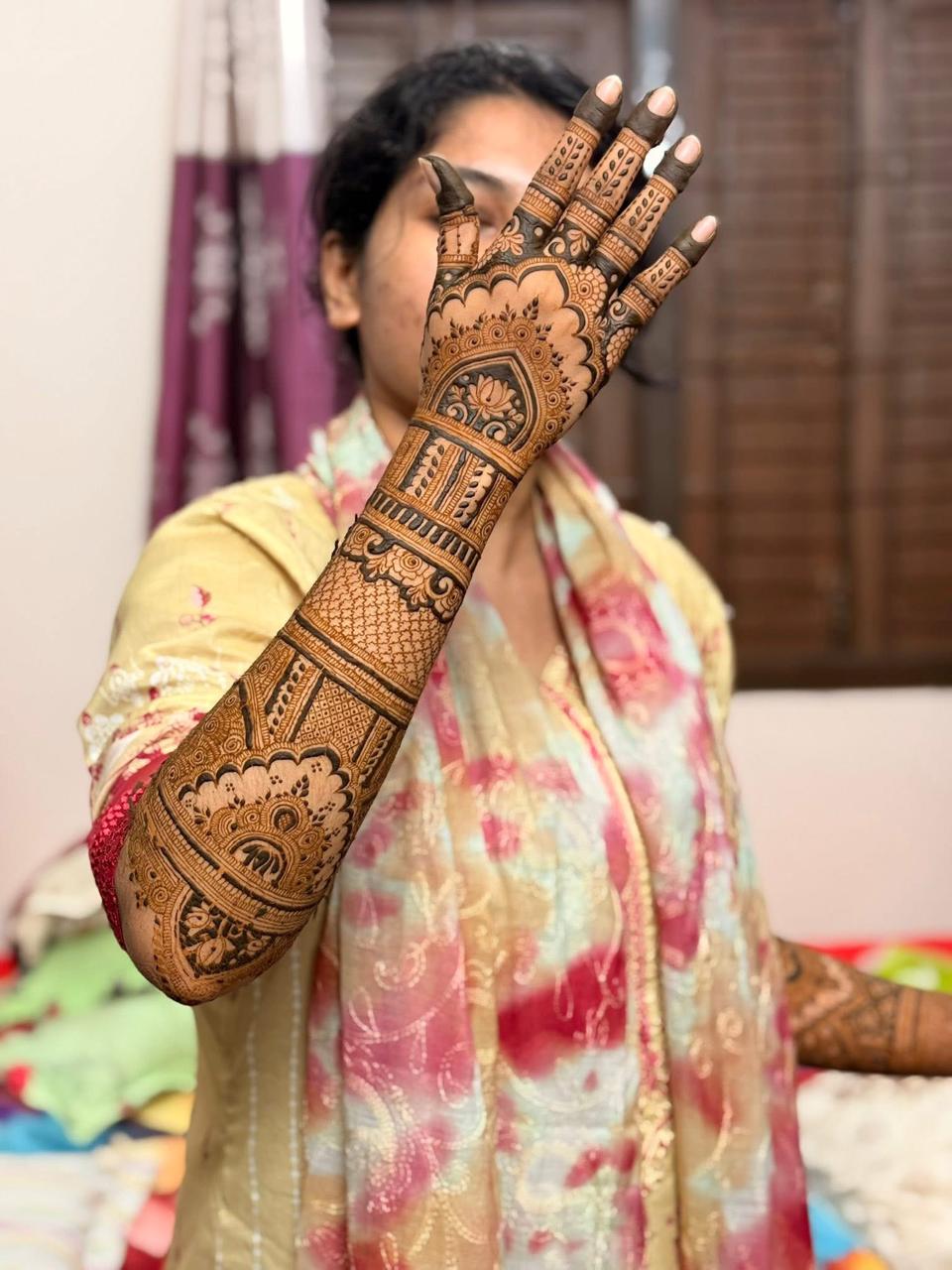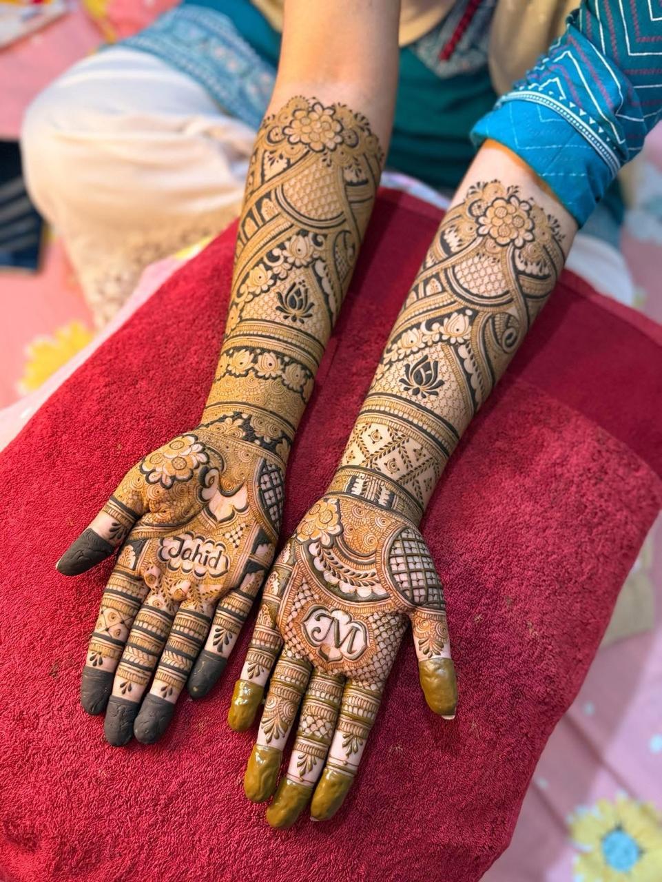 This BEAUTIFUL PATTERN  showcases an elegant full-hand bridal mehndi design extending up to the forearms. The intricate artwork features floral patterns, paisley motifs, net detailing, and decorative bands arranged in a beautiful symmetrical style. The palms are personalized with names and initials, adding a special romantic touch. The rich shading and fine detailing create a luxurious and traditional look, perfect for weddings and grand celebrations.