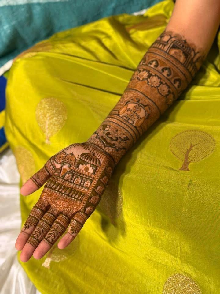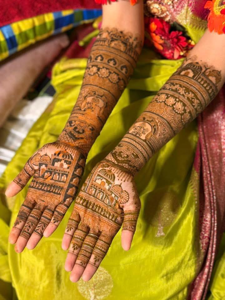 This DESIGN showcases an exquisite bridal mehndi design on both hands . The artwork features grand palace-inspired motifs on the top of the hands , beautifully detailed with domes and architectural elements. Around the ankles, elegant bands display elephant and lotus patterns, adding a royal and traditional touch. The intricate floral detailing on the toes, combined with bold dark shading, creates a rich and luxurious look perfect for weddings and special occasions.