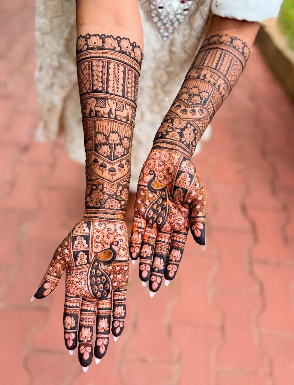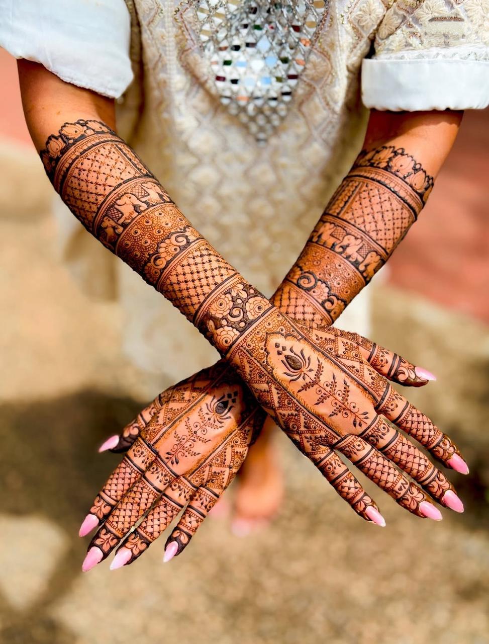 Traditional bridal styles typically extend from the fingertips to the elbows and include detailed patterns on the feet and shins, creating a “glove-like” effect of lace and floral tapestry.