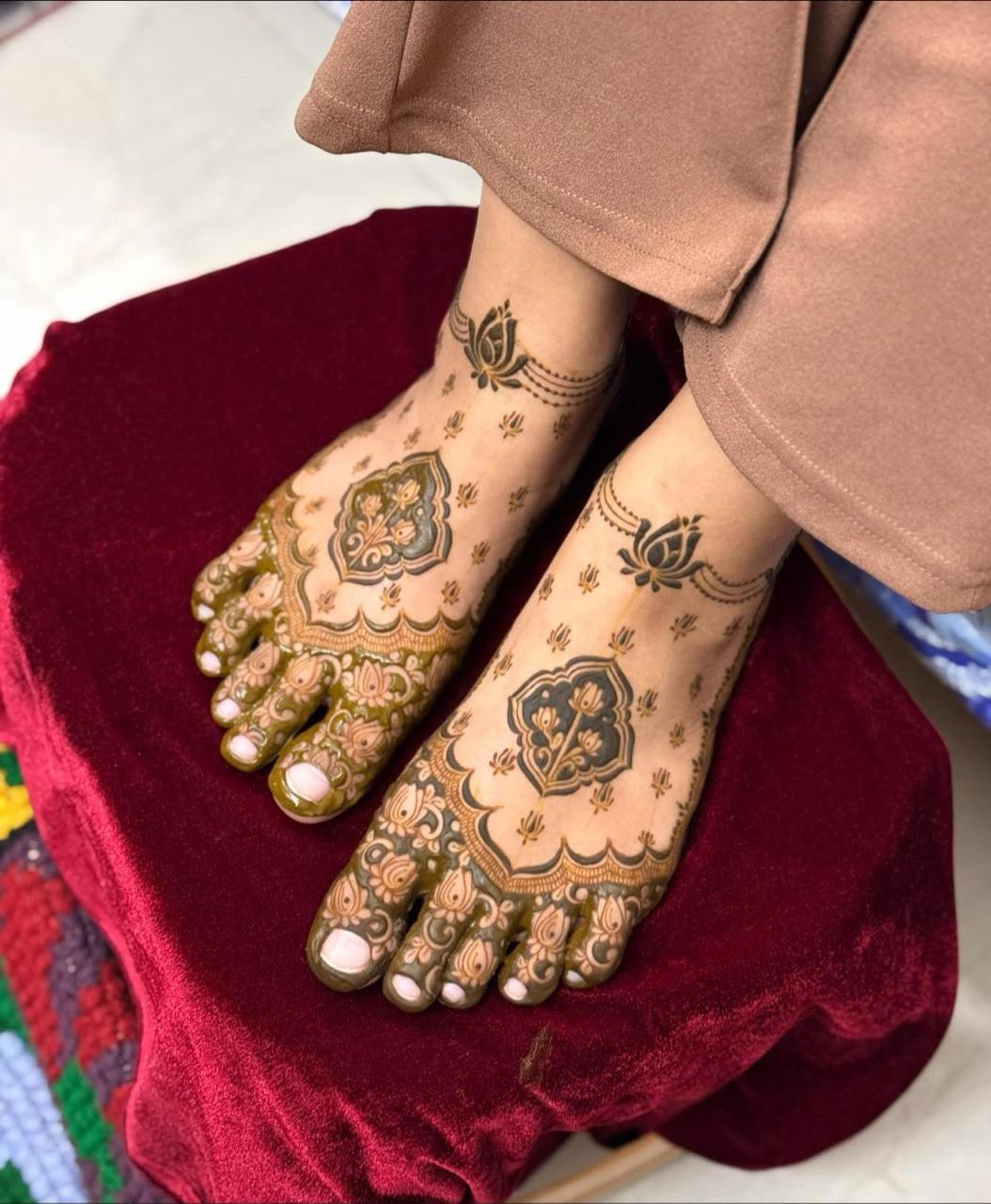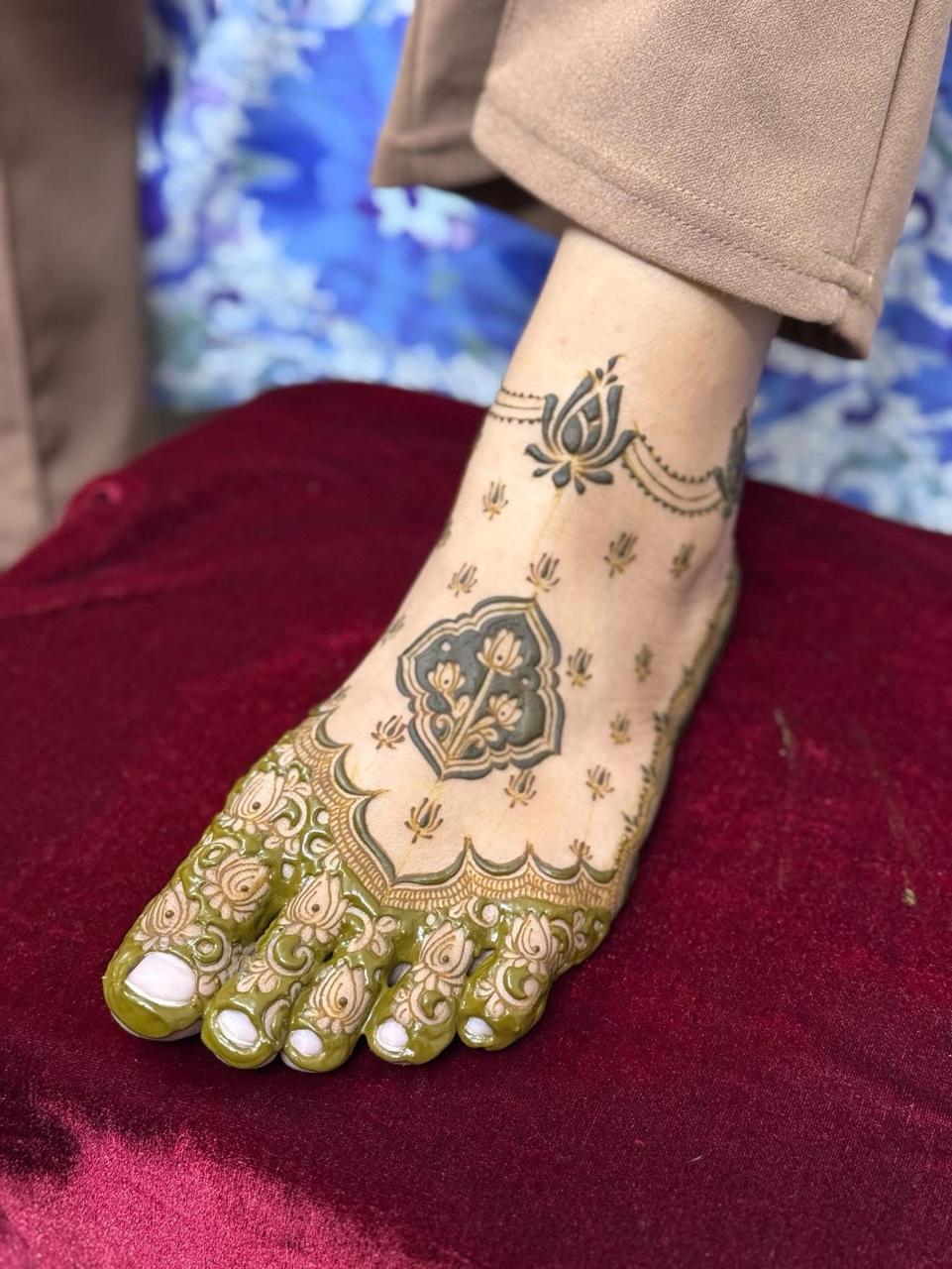 This LEGS DESIGN features a graceful and elegant foot mehndi design with a minimal yet detailed look. The toes are beautifully filled with floral and paisley patterns, highlighted with fresh green henna. The center of the foot showcases a delicate floral motif framed within a decorative shape, while the ankle is adorned with a charming lotus design connected by chain-like patterns. The balanced detailing gives a classy and festive appearance, perfect for weddings and special occasions.