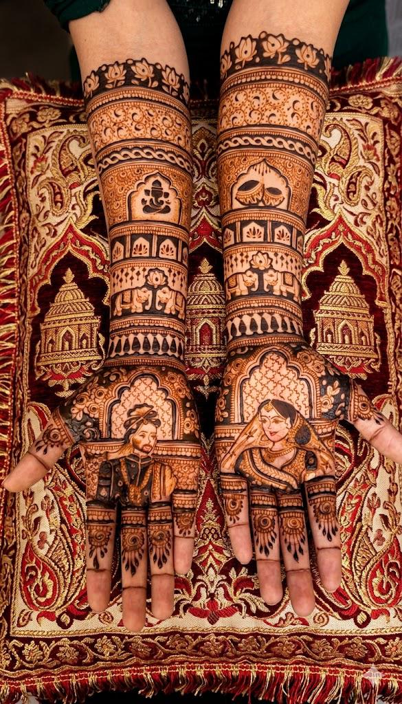 This design shows a stunning bridal mehndi design covering both hands with detailed and traditional patterns. The palms feature beautiful portraits of the bride and groom, symbolizing love and the beginning of their new journey together. The design also includes ELEPHANT , GANESH G ,DHOL , LOTUS , and decorative bands extending up to the arms, giving the mehndi a rich and elegant look. The fine detailing and balanced artwork make this design perfect for a grand wedding celebration.